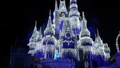 As the clock strikes 7:00pm Mickey's Very Merry Christmas Party begins and to get us in the mood we need some snow and ice to make it really feel like Christmas. What better person to help out but Queen Elsa, direct from Frozen. With her magical fractal powers she transforms the Castle into an ice Palace before your very eyes.