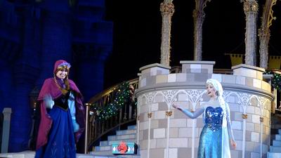 As the clock strikes 7:00pm Mickey's Very Merry Christmas Party begins and to get us in the mood we need some snow and ice to make it really feel like Christmas. What better person to help out but Queen Elsa, direct from Frozen. With her magical fractal powers she transforms the Castle into an ice Palace before your very eyes.