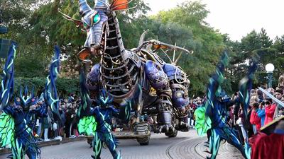 Giant floats parade in front of Sleeping Beauty's Castle and along Main Street accompanied